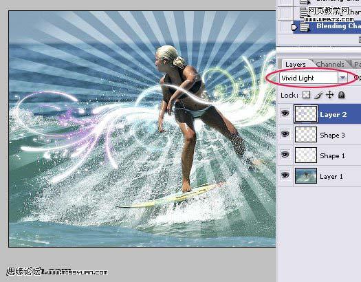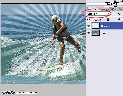 5、最后,設置射線的圖層模式為柔光。如下圖所示: |