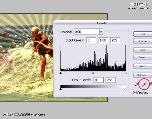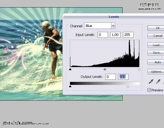 17、下一步是給圖片制作一些樂模和陳舊的效果,就像通常在沖浪公司里看到的那些廣告一樣。要達到70年代的黃色觀感也許只需一步,但我們可以多嘗試幾次,以取得最佳效果。按ctrl+l,打開色階板,通道選擇rgb,點擊中間的吸管,定義我們我們在這張圖片上期望的中間色,我選的是背景圖片海面的深藍色,取得了一個感官良好的黃色。你也可以嘗試點選其他地方得出不同的效果,但基本上是選擇深色和藍色,從而達到下圖效果。 |
