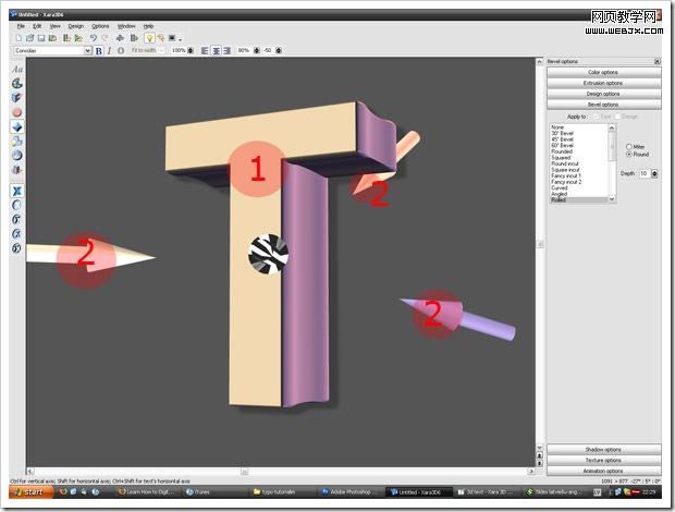 xara 3d教程第一部分:好了,讓我們打開xara 3d教程。值得注意的是這里用的是”xara 3d版本6′。點(diǎn)擊文字選項(xiàng),按下ctrl+a來刪除現(xiàn)有的文字,然后寫下字母t,根據(jù)你的喜好選擇你要的字體,最后按確定。