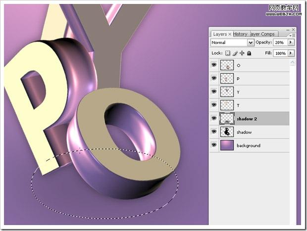 4在字母的下方畫一個(gè)橢圓選區(qū),然后改變透明度為20-40%;