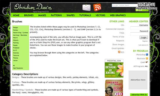 obsidian dawn提供免費的photoshop筆刷、樣式和教程。筆刷部分包括許多有用且居吸引力的筆刷,它們使用design brushes和nature brushes等目錄加以分類。