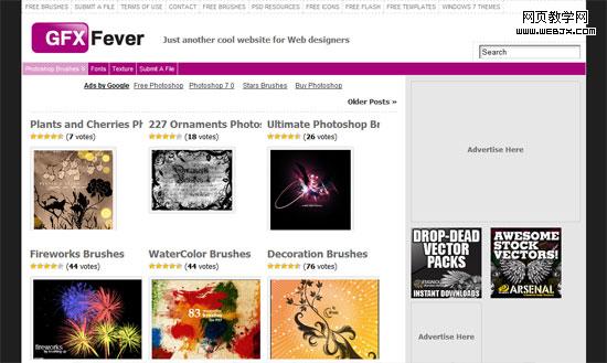 gfxfever.com的目標人群是網站設計人員,旨在分享圖像與網頁設計資源。其photoshop欄目提供了大量清亮的筆刷供免費下載。和許多筆刷下載網站一樣,你可以為筆刷打分并以此判斷筆刷的質量。