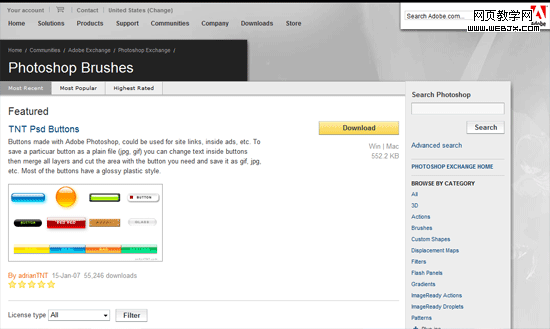 photoshop軟件的開發者,adobe,有一個鮮為人知的板塊:phothshop筆刷專欄。在adobe上你可以找到近1000套筆刷。瀏覽most popular板塊去看看哪些筆刷下載的最多。