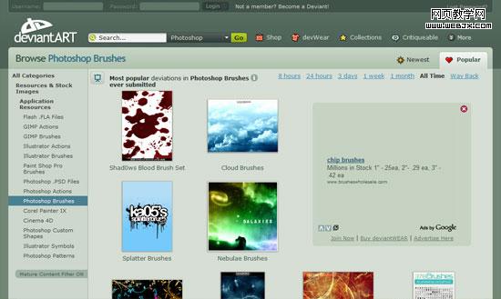 deviantart線上頗具影響力的圖形設計組織,它提供了大量高質量的用戶提交的photoshop筆刷。這里有許多筆刷供你研究和下載,其中不僅包括流行的碎片主題(fractals)、濺潑主題(splatter)、鮮花綻放主題等,還包括了像天使翅膀、卡通人物眼睛等本站獨有的筆刷。