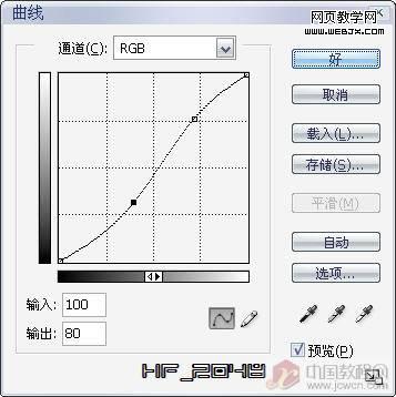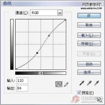 5.下一步就是對眼睛進行調整,眼睛是最傳神的部位,所以要增它的明暗對比度和層次感。先用“多邊形套索工具”把眼睛選出來,然后進行“曲線”調整(如圖)。這樣調可以使眼睛更傳神。不要小看這些細節的調整,這可對照片最后的效果起著很大的作用。