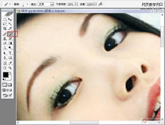 4.現在再對人物的睫毛進行調整,先新建一層(為了方便以后調整),選黑色畫筆,不透明度設為30%,大小調到1像素,把圖片放大,給人物的加睫毛。