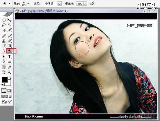 3.現在我們就來對人物的細節進行調整。首先我們新建一層,按ctrl+shift+alt+e(蓋印可見層),用“減淡工具”對人物臉部進行涂抹,使更通透些。