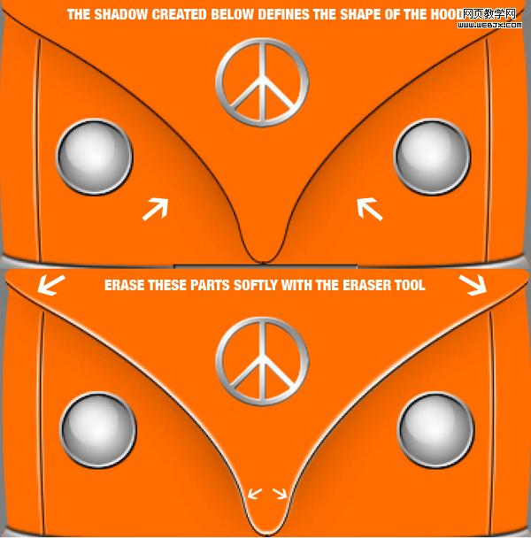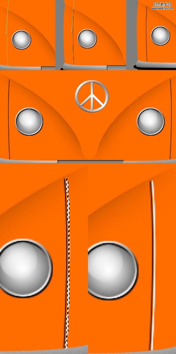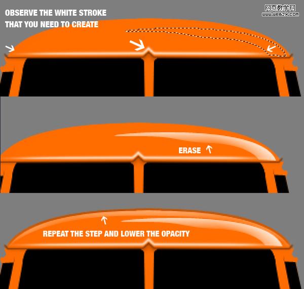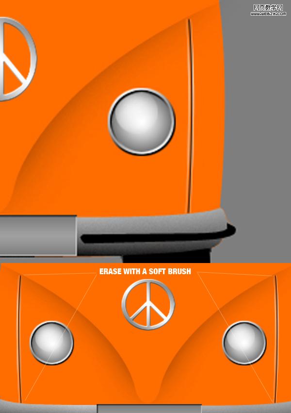 重復步驟12,不過這一次你要把這些線條放到車的不同地方。黑色線頭畫好后,復制到它的上面。跟之前一樣,用反相變為白色。使用橡皮擦工具輕輕地擦出部分線條。你還需要另做跟白色線條一樣的線,不過保持黑色不變,放到第一條線的下面。跟上面一樣,用顏色加深工具在橙色圖層上加上輕輕的陰影。