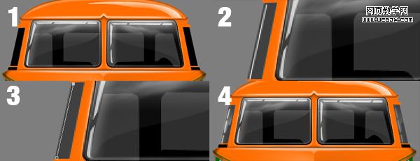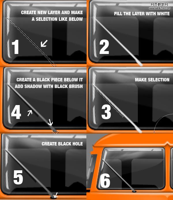 是時候處理擋風玻璃并讓它們變透明了。用和以前一樣的方法:新建圖層,建立選區,用白色填充,然后擦除或者降低不透明度。