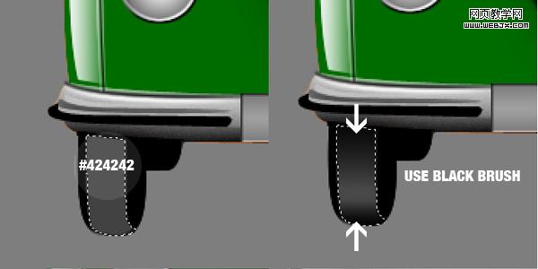 輪到處理車輪了。創建一個新層,使用套索工具建立如圖選區。用#424242填充這個圖層。然后用一個軟黑畫筆,沿著圖層邊緣畫。