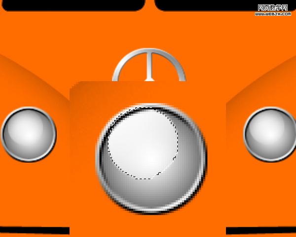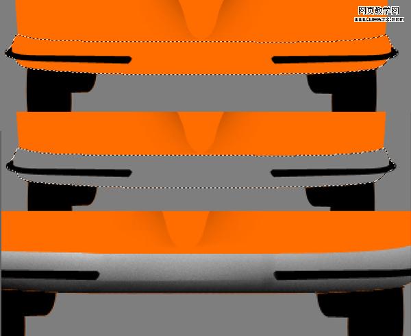 在這個步驟我們要做保險杠部分。首先創建一個新層,命名為“bumper”。使用鋼筆工具建立一個路徑,然后轉為選區(ctrl+回車)。接著把這個圖層用同樣的橙色填充,然后對圖層去色。