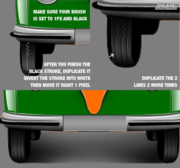 現在我們來給車加些簡單的線條,這樣可以更好地凸顯車的形狀。使用鋼筆工具,畫兩條如圖所示的路徑。把筆刷設為1px,顏色設為黑色。然后把每條線復制3次,按ctrl+i把復制的線條變為白色。最后把它們放到黑色線條的旁邊。你也可以用橡皮擦工具(