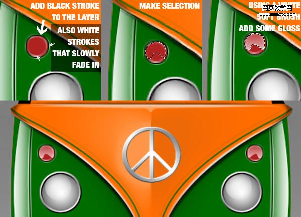 現在來為車篷加點光澤效果。如圖所示建立一個選區,接著使用徑向漸變工具從白色到透明填充。然后把這個圖層復制并移到車的另一邊。