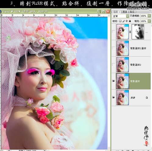 3、選擇菜單:圖像 > 模式 > rbb顏色,選擇合拼,把背景圖層復制一層,做降噪處理。