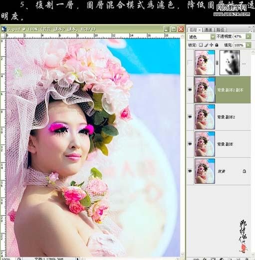 5、復制一層,圖層混合模式改為“濾色”,圖層不透明度改為:47%,效果如下圖。