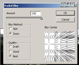 3、選擇最上面的那個圖層,執(zhí)行濾鏡——模糊——徑向模糊,參數(shù)為(大小100,方式放射,質(zhì)量最佳),如圖;