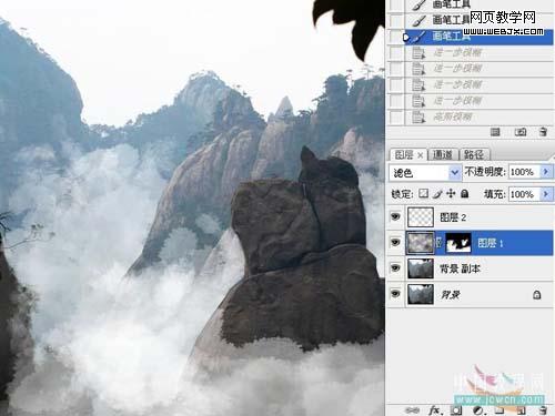 5、在圖層蒙板上操作,選用“粗邊圓形鋼筆”畫筆,前景色為白色,根據情況適當調整畫筆的不透明度、大小、硬度,在需要有云彩的地方涂抹。對一些云霧較濃的地方,可以再新建一層,使用白色畫筆直接在圖層上涂抹。在需要區分遠景和近景的地方,調用剛剛做的選區進行精細涂抹,以突出云彩的層次感。 |