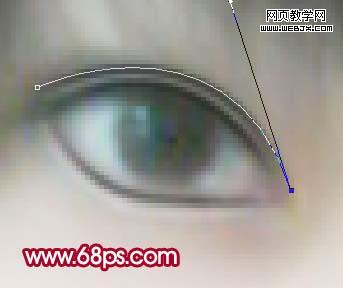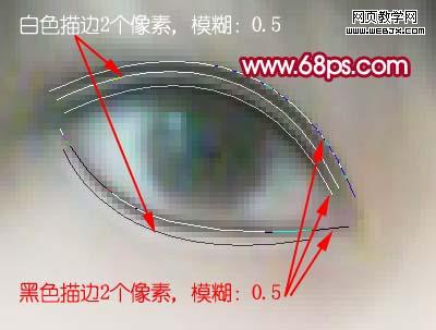 5、雙眼皮的制作。有很多教程都說過。這里我簡單介紹一下。選擇畫筆工具,筆刷大小設為2像素,前景顏色設置為黑色,用鋼筆工具勾出圖9所示路徑,右鍵選擇路徑描邊,選擇畫筆,可以不勾選模擬壓力。確定后執(zhí)行:濾鏡 > 模糊 > 高斯模糊,數(shù)值為0.5,同樣方法勾其它路徑如圖10,效果如圖11。效果有點恐怖,主要是眼珠部分還沒有做好,后面再處理。
