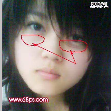 再來處理一下雜亂的頭發(fā)和黑眼圈。如圖2紅圈位置為要處理的部分,先用吸管吸取附近干凈皮膚顏色,然后選擇畫筆工具,畫筆不透明度為:5%,涂抹需要除掉的部分。涂的時候用力要均勻。效果如圖3。
