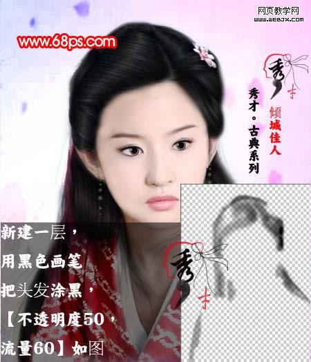 1、打開一張圖復制一層,這是作圖的習慣,然后給人物簡單磨皮。 2、新建一個圖層,用黑色畫筆把頭發涂黑,畫筆設置:不透明度:50%,流量:60。