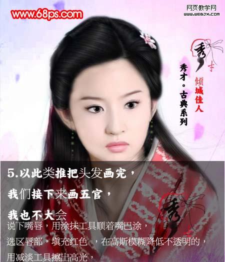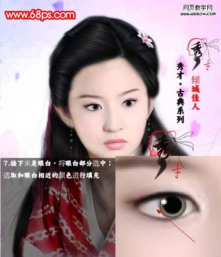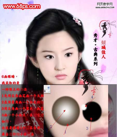 5、以此類推,把頭發畫完,我們接下來畫五官。 6、首先是眼睛,先用尖角畫筆畫一個大的圓,再用柔角畫一個白色的較小的圓點,然后用尖角的點一個小白點,把幾個圖層組合起來即可。 7、接下來是眼白,將眼白部分選中,選取和眼白相近的顏色進行填充。