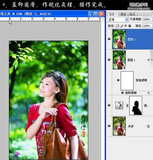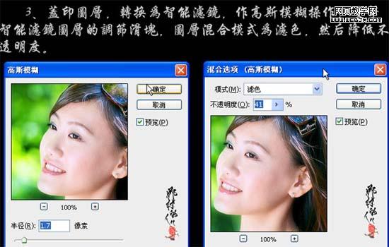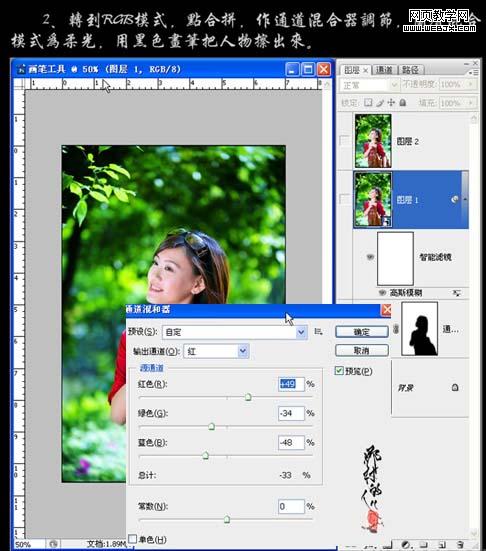 2、選擇菜單:圖像 > 模式 > rgb顏色,選擇合拼。創(chuàng)建通道混合器調(diào)整圖層,選擇紅色調(diào)整,參數(shù)設(shè)置如下圖,確定后把圖層混合模式改為“柔光”,用黑色畫筆把人物擦出來(lái)。 3、新建一個(gè)圖層,按ctrl + alt + shift + e蓋印圖層,轉(zhuǎn)換為智能濾鏡,執(zhí)行:濾鏡 > 模糊 > 高斯模糊,數(shù)值為1.7,雙擊智能濾鏡圖層的調(diào)節(jié)滑塊,圖層混合模式改為“濾色”,圖層不透明度改為:41%。 4、新建一個(gè)圖層,蓋印圖層,適當(dāng)?shù)匿J化處理,完成最終效果。