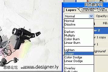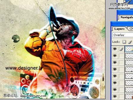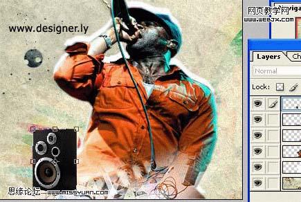 11、編輯-變換-水平翻轉。 12、添加裝飾器材,用套索工具裁出音箱。 13、編輯-自由變換(ctrl+t),調整音箱大小。 14、裝飾器材圖層模式為疊加。