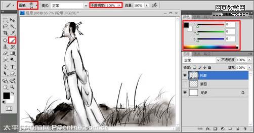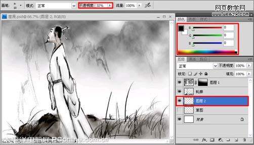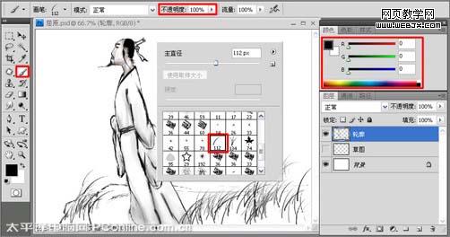 <圖16> 17、按組合鍵ctrl+shift+n新建“圖層2”,再把“圖層2”拖到“輪廓”圖層的下面;選擇畫筆工具,設(shè)置畫筆筆尖為“半濕描油彩筆”,前景色設(shè)置為黑色,如圖17所示。