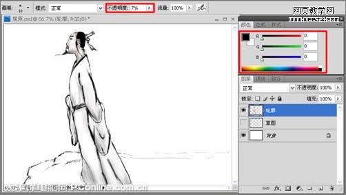 <圖7> 8、再把前景色設(shè)置為黑色,畫筆的不透明度設(shè)置為7%~9%左右,涂畫衣服陰影部分顏色,如圖8所示。