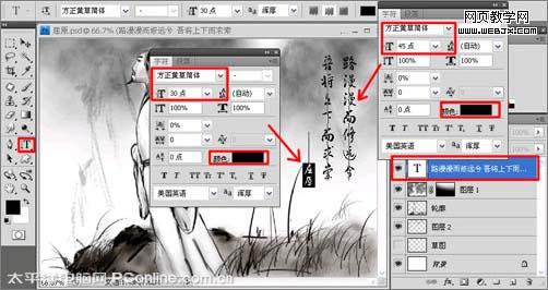 19、選擇工具箱中的直排文字工具,在頁面右側(cè)處輸入題字,在圖層面板中自動(dòng)生成與輸入的文字相對應(yīng)的文本圖層,文字的字體設(shè)置為:方正黃草簡體,顏色設(shè)置為黑色,題字的字號設(shè)置為:45點(diǎn),題名文字的字號設(shè)置為:30點(diǎn),如圖19所示。