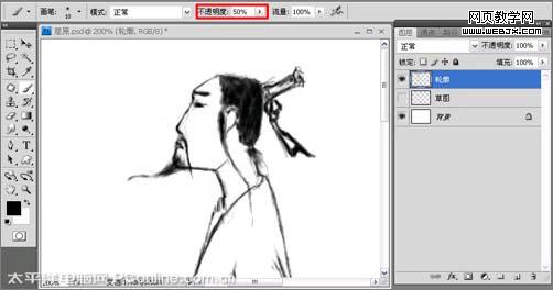 <圖5> 6、把畫筆的不透明度設(shè)置為50%左右,結(jié)合左右中括號鍵適當(dāng)?shù)恼{(diào)整筆尖的大小,涂畫人物的頭發(fā)以胡子等,如圖6所示。