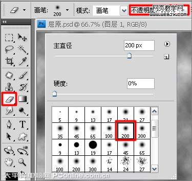 <圖12> 13、選擇工具箱中的橡皮擦工具,橡皮擦筆尖選擇為柔角,大小可結(jié)合左右中括號鍵進(jìn)行調(diào)整,不透明秀設(shè)置為:100%,如圖13所示。