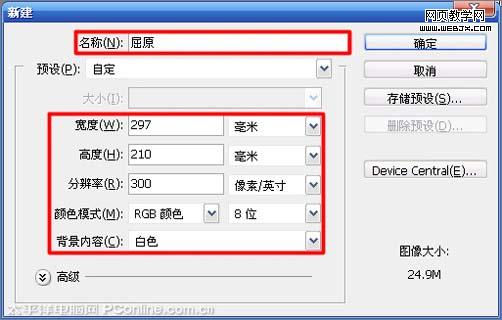 1、打開photoshop cs4軟件,執(zhí)行菜單:“文件”/“新建”(快捷鍵ctrl+n),彈出新建文件窗口,命名文件為:屈原,文件的大小與分辨率等的設(shè)置如圖1所示。 |