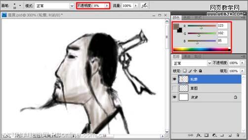 7、調(diào)整設(shè)置前景色rgb值,將畫筆不透明度設(shè)置為7%~9%,利用畫筆涂畫人物臉部顏色,對深色部分進(jìn)行反復(fù)涂抹,前額頭發(fā)進(jìn)行調(diào)整,如圖7所示。