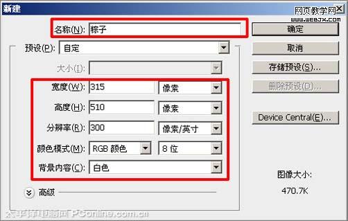 1、執(zhí)行菜單:“文件”/“新建”(快捷鍵ctrl+n),新建一個空白文件,設(shè)置名稱:粽子;寬度:315像素;高度:510像素;分辨率:300像素,如圖1所示。 |