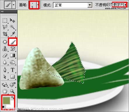 18、按住ctrl鍵單擊粽子圖層,載入選區(qū),前景色設(shè)置為:#93a359,使用畫筆工具,設(shè)置畫筆大小為5像素,不透明度為:35%,繪制出粽子葉的紋理,如圖26所示。