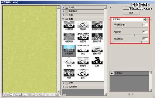 3、執(zhí)行菜單:“濾鏡”/“素描”/“水彩畫筆”,彈出“水彩畫筆”對話框,設(shè)置參數(shù)如圖3所示;效果如圖4所示。