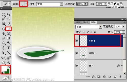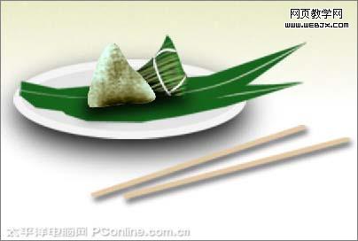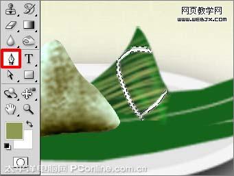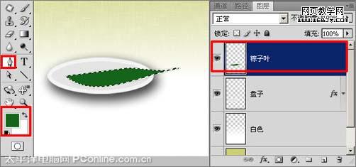 <圖12> 8、執(zhí)行菜單:“圖層”/“新建”/“新建圖層”(快捷鍵ctrl+shift+n),新建圖層并命名為“粽子葉”,使用鋼筆工具,勾勒出葉子的形狀,按ctrl+enter鍵得到選區(qū),前景色設(shè)置為#15481a,按alt+delete鍵填充綠色,如圖13所示。
