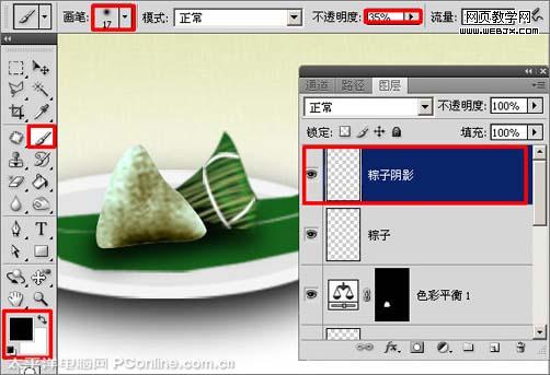 <圖27> 20、新建圖層并命名為“粽子陰影”,按d鍵恢復(fù)黙認顏色,使用畫筆工具,設(shè)置畫筆大小為17像素,不透明度為:35%,繪制出陰影,如圖28所示。