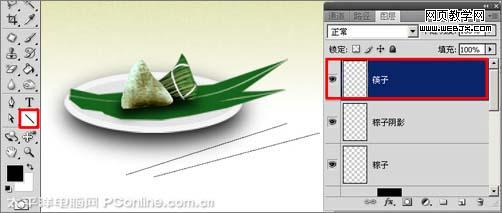 <圖28> 21、新建圖層并命名為“筷子”,選擇直線工具,繪制出兩條直線,如圖29所示;按ctrl+enter鍵得到選區(qū),執(zhí)行菜單:“編輯”/“描邊”,彈出“描邊”對話框,設(shè)置參數(shù)如圖30所示;按ctrl+d鍵取消選區(qū),效果如圖31所示。