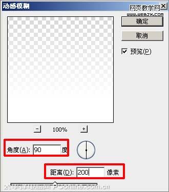 5、執(zhí)行菜單:“濾鏡”/“模糊”/“動感模糊”,彈出“動感模糊”對話框,設(shè)置參數(shù)如圖6所示;效果如圖7所示。