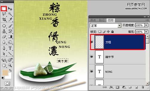<圖37> 25、新建圖層并命名為“方框”,使用矩形選框工具,把“端午節(jié)”框選出小矩形,如圖38所示;執(zhí)行菜單:“編輯”/“描邊”,彈出“描邊”對話框,設(shè)置參數(shù)如圖39所示;按ctrl+d鍵取消選區(qū),最終效果如圖40所示。