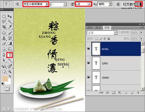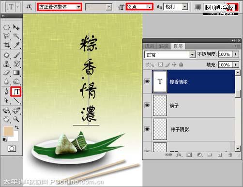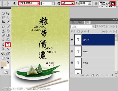 25、選擇橫排文字工具,輸入“端午節(jié)”,設(shè)置字體為:方正隸變繁體,大小為:5點,顏色為:黑色,如圖37所示。