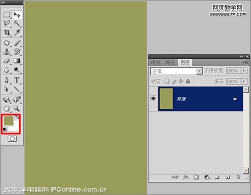 2、設(shè)置前景色為#:989c58,按alt+delete鍵填充顏色,如圖2所示。 |