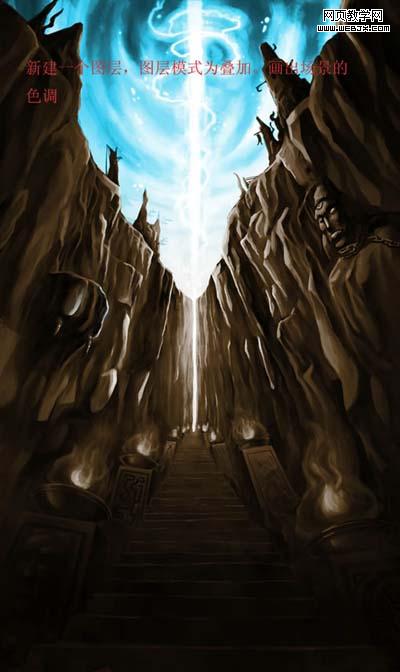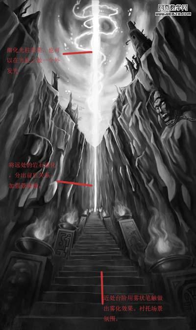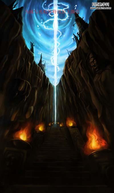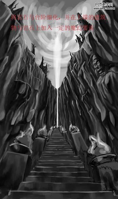2、將底色改為灰色,并加上陰影: 3、加入火焰和光柱等特效,確定光陰效果: 4、將巖石與臺階細化,并在上端的建筑物與巖石上加入一定的魔幻要素: