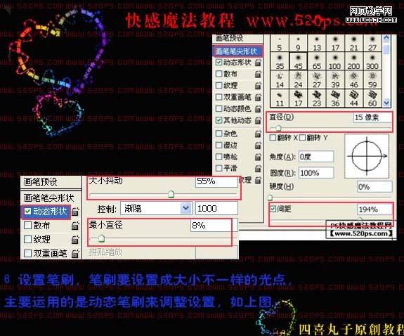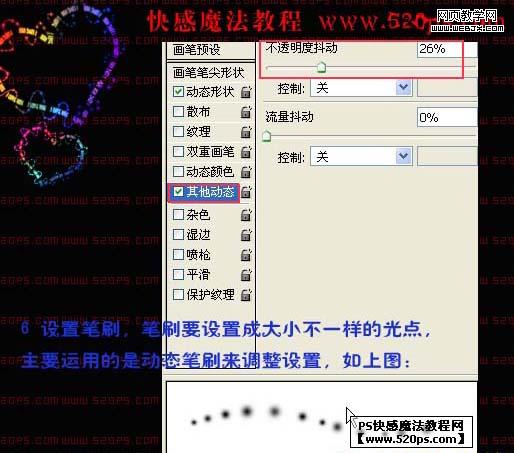 5、接著我們來繪制繞圈的路徑,這里我簡單的給大家說下,繪制路徑主要用到的是鋼筆工具和轉(zhuǎn)換點(diǎn)工具,還有就是直接選擇工具,通過鋼筆工具繪制錨點(diǎn),鼠標(biāo)拖動調(diào)整曲率,轉(zhuǎn)換點(diǎn)和直接選擇工具來調(diào)整句柄,就可以做出大家想要的曲線了。 6、設(shè)置筆刷,筆刷要設(shè)置成大小不一樣的光點(diǎn),主要運(yùn)用的是動態(tài)筆刷來調(diào)整設(shè)置,如圖: