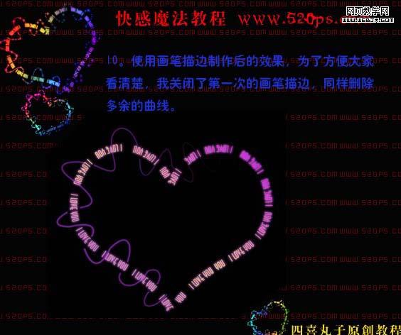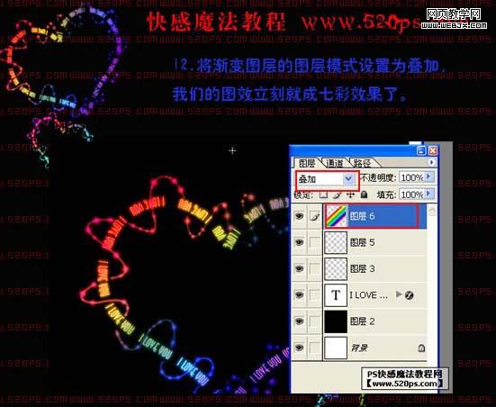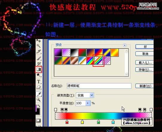 10、使用畫筆描邊制作后的效果,為了方便大家看清楚,我關(guān)閉了第一次的畫筆描邊,同樣刪除多余的曲線。 11、新建一層,使用漸變工具繪制一條漸變線條,如圖。 12、將漸變圖層的圖層模式設(shè)置為疊加,我們的圖效立刻就成七彩效果了。