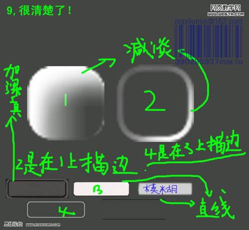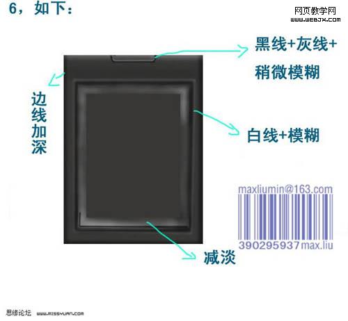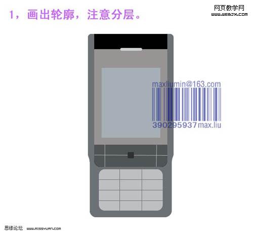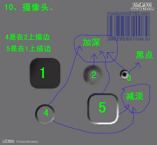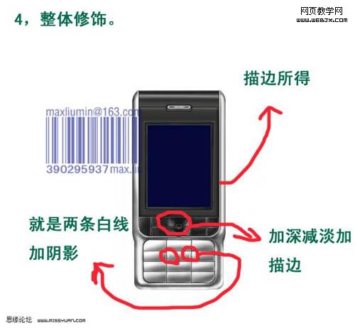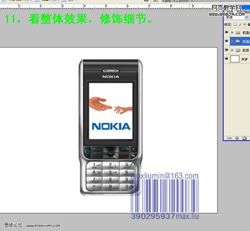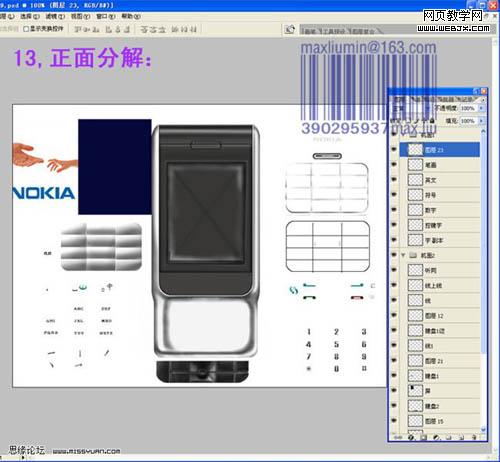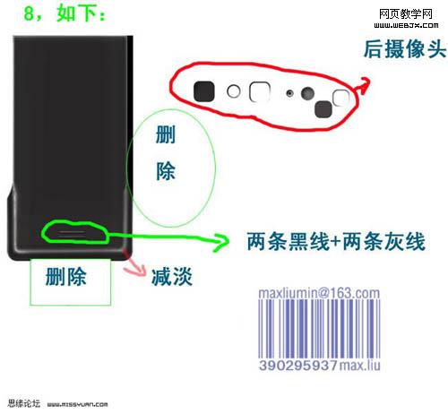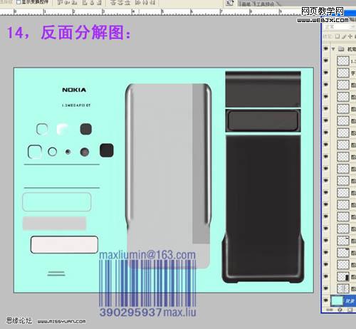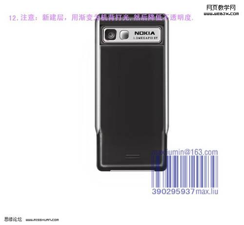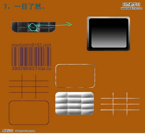 11、看看整體效果,有不滿意的部分可以繼續修改。 12、新建一個圖層,用漸變為手機背部打光,然后降低不透明度。 13、正面各元素分解圖。