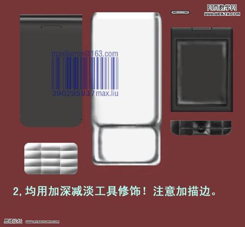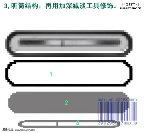 2、用加深/減淡工具調出質感。 3、聽筒的結構,畫出底圖后用加深減淡工具修飾。 4、整體外殼效果。