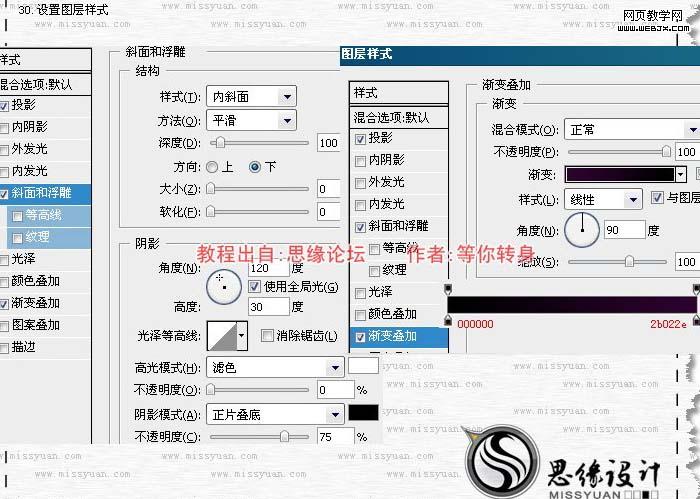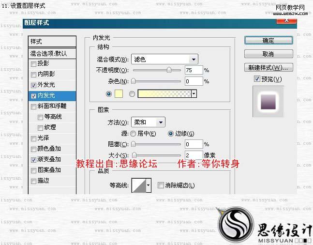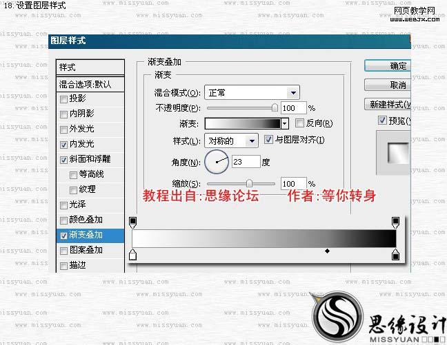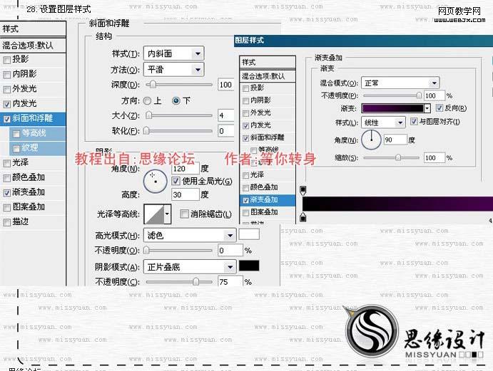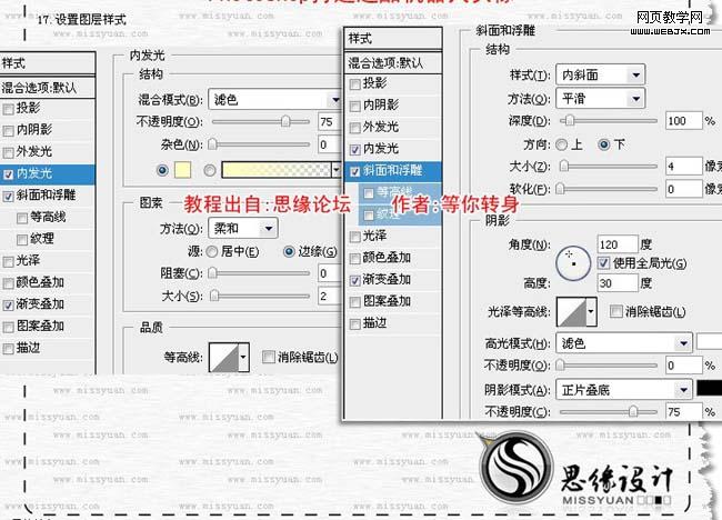 17、設置圖層樣式:內發光,下面和浮雕。 18、設置圖層樣式:漸變疊加。 19、把剛才操作的圖層復制一層,清除圖層樣式,再把圖層填充改為:0,然后雙擊圖層調出圖層樣式,先設置:投影,內陰影。